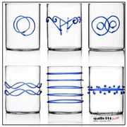 The perfectly matched complete set, the transparent color with blue embossed decorations, the practical craftsmanship and the different designs proposed for each glass, this is what you immediately notice about these glasses born from the idea of Forti and Di Loreto.