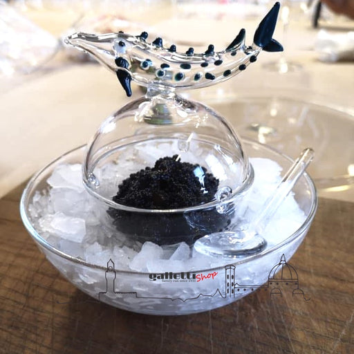 The caviar bowl consists of a spherical cup with a lid and a larger cup to hold ice.The package also contains a spoon in borosilicate glass with de...